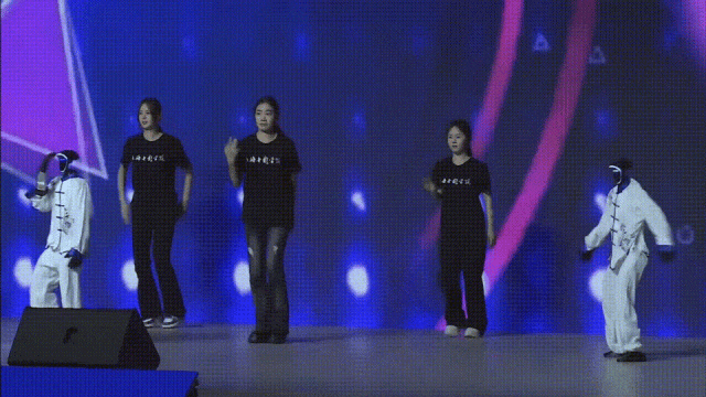 舞台两侧,智元远征A2与灵犀X2机器人联袂亮相,他们穿着戏服敲锣打鼓,站在中央的机器人挥着手臂舞得正嗨。